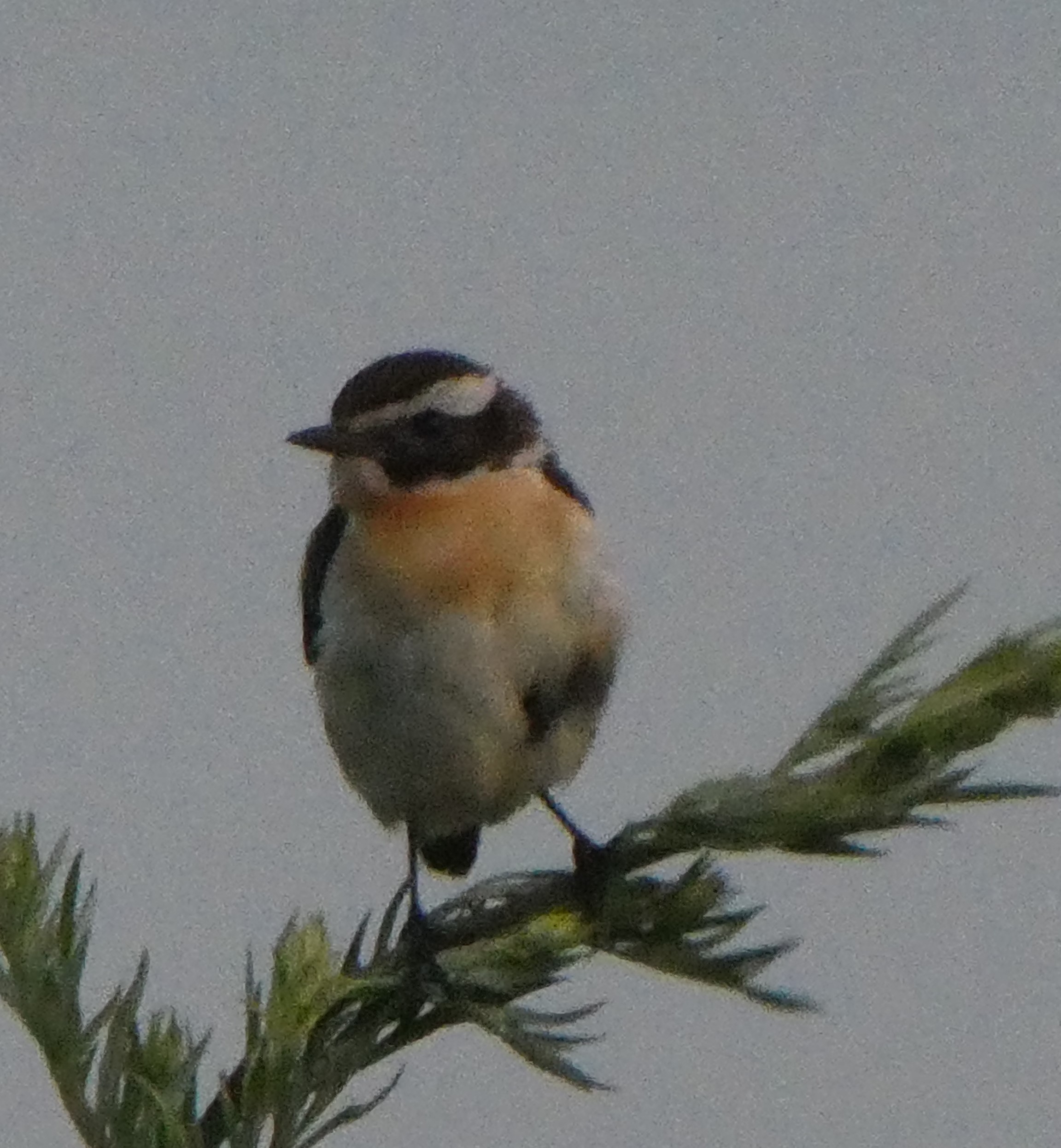 The stonechat is 11.5–13 cm long and weighs 13–17 g, slightly smaller than the European robin. Both sexes have distinctively short wings, shorter than those of the more migratory whinchat and Siberian stonechat. The summer male has black upperparts, a black head, an orange throat and breast, and a white belly and vent. It also has a white half-collar on the sides of its neck, a small white scapular patch on the wings, and a very small white patch on the rump often streaked with black.